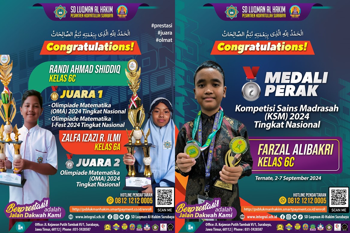 12 Prestasi Gemilang di Ajang Kompetisi Kancah Nasional. Siswa-siswi SD Luqman Al-Hakim Surabaya kembali menorehkan prestasi di beberapa ajang lomba bergengsi tingkat nasional. Mulai Kompetisi Sains Madrasah (KSM), Olimpiade Matematika (OMA), hingga Kejurnas Silat Championship. Di awal semester kedua tahun 2024 ini, sekolah ber-tagline “Sekolah Tauhid, Sekolah Para Juara” berhasil memenangkan 9 prestasi. Berkat semangat berprestasi yang terus tertanam, para siswa berhasil membawa pulang gelar juara di bidang sains, matematika, dan bela diri.